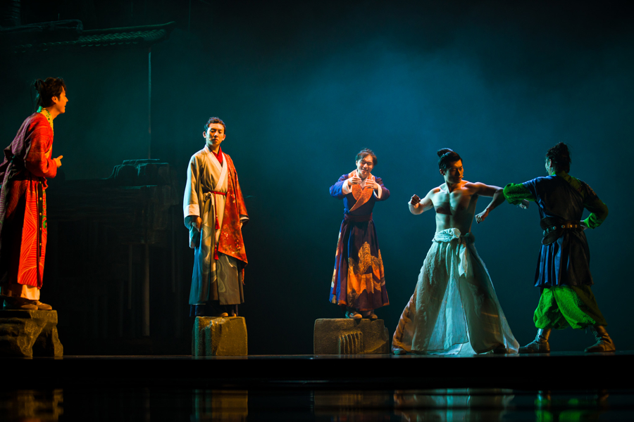 《江南·十二场欢聚》以“时空交错”为叙事头绪,串联范蠡、苏轼、徐灵胎等十三位江南名士与现代江南女孩的精神对话。全剧以十三个两千年中一心想干大事并干成了大事的江南少年们,和两位不想干大事却干成大事的江南女孩邂逅的故事张开,其中达生、蓉镜两位女性脚色如同穿越时空的信使,在古今对话中传递遐想、信守与家国情感。